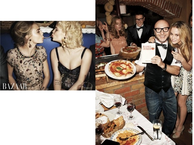 Today, Herzigova is one of the guests of honor at a dinner party in London that Domenico and Stefano organized especially for Bazaar, as seen through the eyes of photographer Terry Richardson. In traditional Italian style, the red wine is flowing, the pasta is overflowing, and, at one point, the designers find themselves in the kitchen making pizzas. Stefano planned the day’s soundtrack, an old-school mix of big-band classics including “Mambo Italiano,” the anthem at the spring show. But the sounds heard most often are shouts of “Bellissima!” and “Bella!”